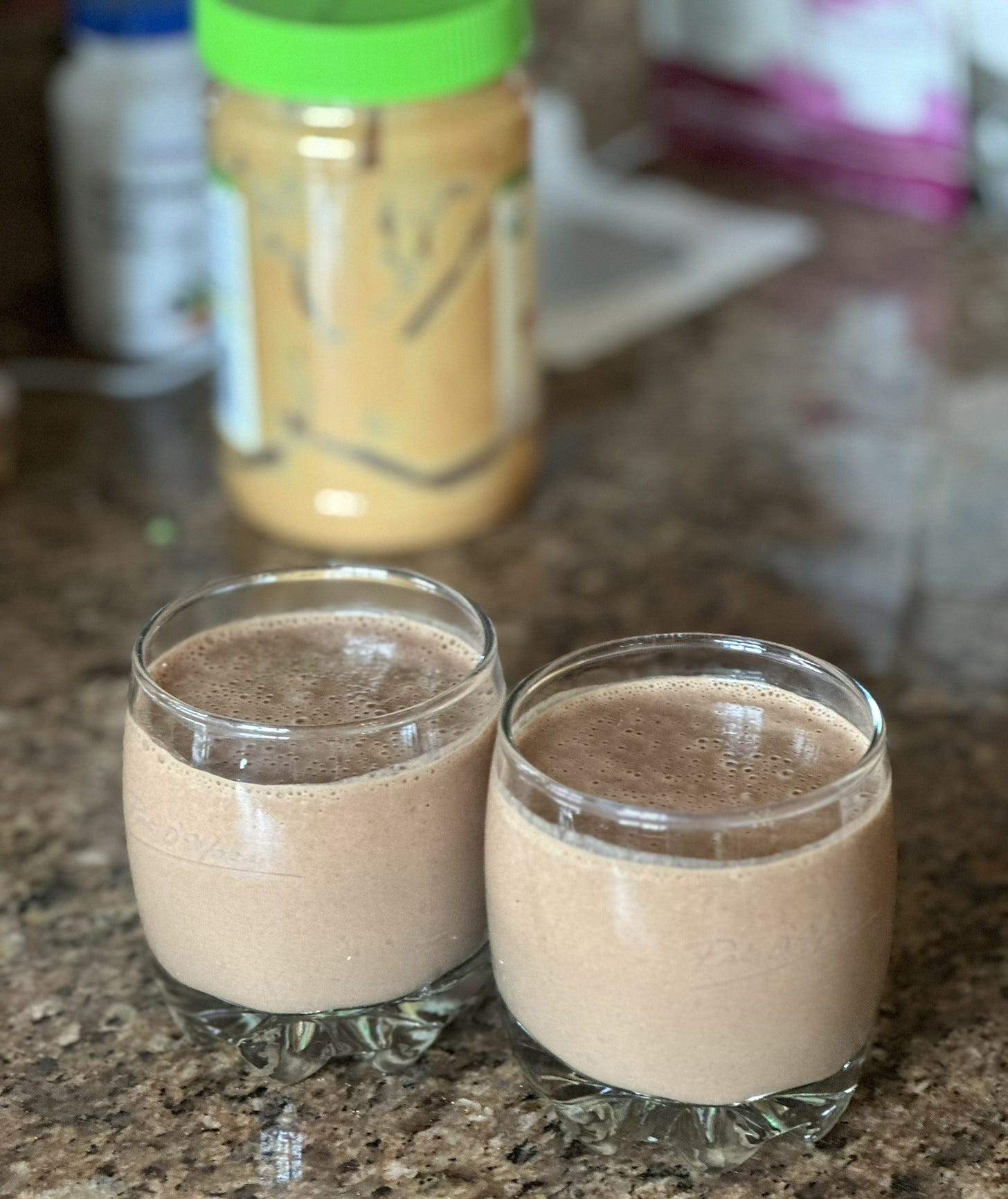 This recipe tastes like a creamy chocolate shake to us. It makes enough for my husband and me at about two 8 ounce glasses. We’ve gotten used to less sugar, so you may need to add a little maple syrup to sweeten it. Otherwise on a hot summer day, it’s the perfect late afternoon treat. And strangely enough, the peanut butter helps to control our glucose levels all the way through dinner.